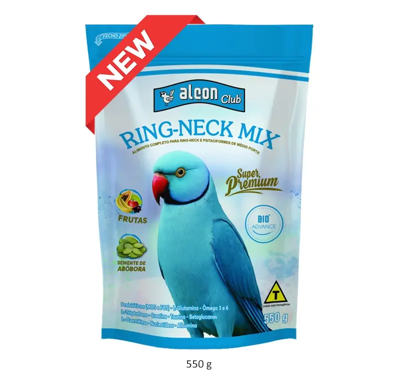 Alcon Club Ring-Neck Mix Super Premium é um alimento completo de alta palatabilidade e digestibilidade, especialmente formulado para psitaciformes adultos de médio porte, como Ring-Neck, Grande Alexandre, Mustache, Marianinha, Maritaca e outros com hábitos alimentares semelhantes.