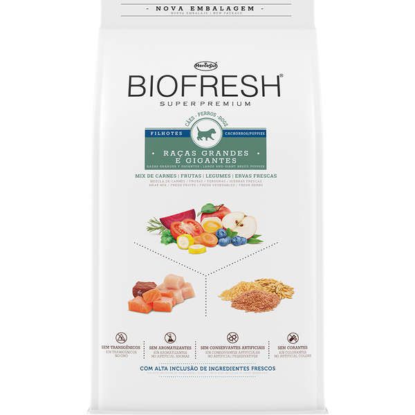 Ração Biofresh Mix de Carne, Frutas, Legumes e Ervas Frescas Cães Filhotes de Raças Grandes e Gigantes é um alimento super premium incluindo alimentos selecionados e frescos. Oferece uma boa qualidade a saúde intestinal e oral repondo os nutrientes diários.