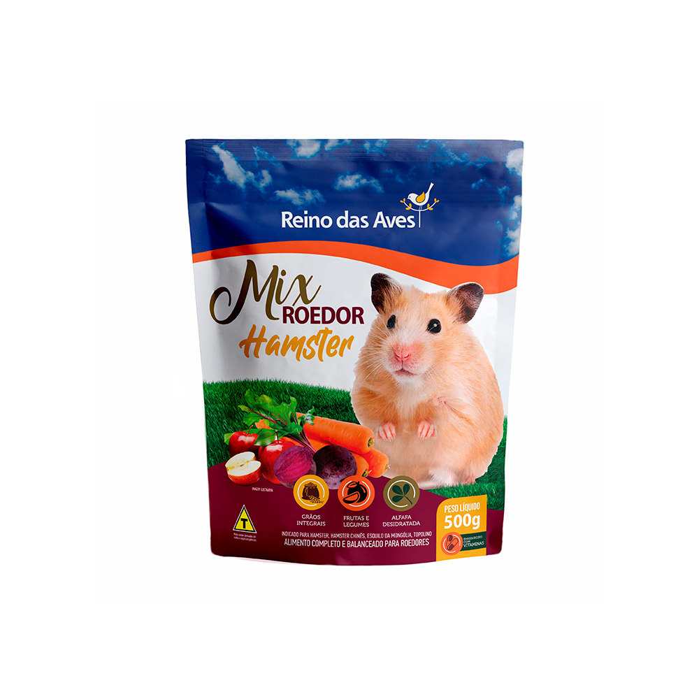 Cenoura Desidratada (mín. 0,2%). Maçã Desidratada (mín. 2,5%), Beterraba Desidratada (mín. 0,4%), Laranja e Mamão Desidratados (mín. 5%), Aveia com Casca, Girassol Miúdo, Milho Moído(1), Farelo de Trigo, Farelo de Soja(2), Gérmen de Milho Integral(1), Casca de Arroz, Sacarina Sódica, Neoespiridina, Dióxido de Silício, Farinha de Ostras, Cloreto de Sódio, Óleo Vegetal, Vitamina A, Vitamina D, Vitamina E, Vitamina B1, Vitamina B2, Vitamina B6, Niacina, Ácido Pantotênico, Ácido Fólico, Vitamina C, Sulfato de Ferro, Sulfato de Cobre, Óxido de Zinco, Sulfato Manganês, Iodato de Cálcio, Selenito de Sódio, Sulfato de Cobalto, Aditivo Antifungico (Propionato e cálcio), Aditivo Antioxidante (B.H.T.), Aroma de Frutas.